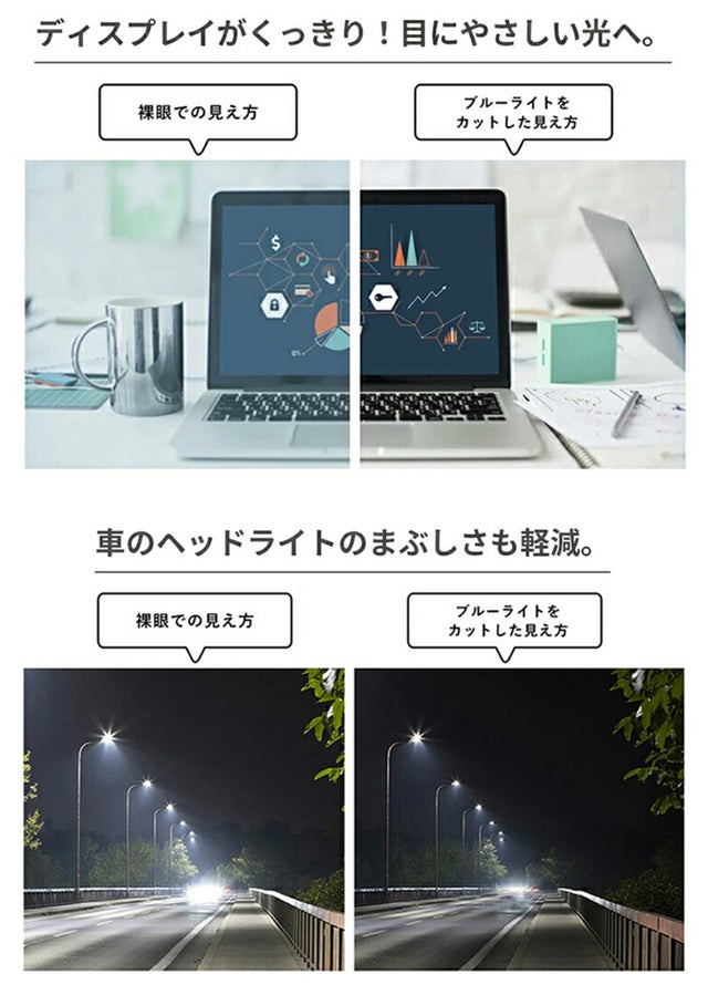 ブルーライトは散乱しやすいため眩しさの原因になります。パソコン用レンズはチカチカするブルーライトをカットしてくれるので、パソコンのディスプレーがくっきりと見やすくなります。また、LEDライトの眩しさを和らげるため、夜間運転でのご使用や歩行の際、ヘッドライトの眩しさ対策にも役立ちます。