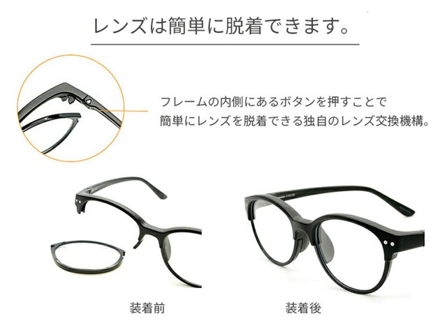 レンズ交換をする際は、フレームの前枠ごと交換します。フレーム内側にあるレンズ交換用のボタンを押すことで簡単にレンズ枠を脱着し交換できます。
