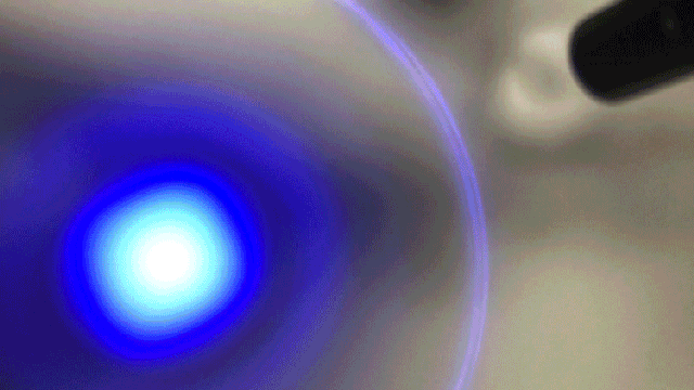 レンズの奥の青い光に注目してください。照射されたブルーライトは、一般的なレンズを通しても光の濃さにほとんど変化がありません。パソコン用レンズを通すと、奥の青い光はかなり薄くなっています。これはレンズがブルーライトを反射することで、レンズを透過するブルーライトを少なくしているからです。このようにブルーライトから目を守ります。