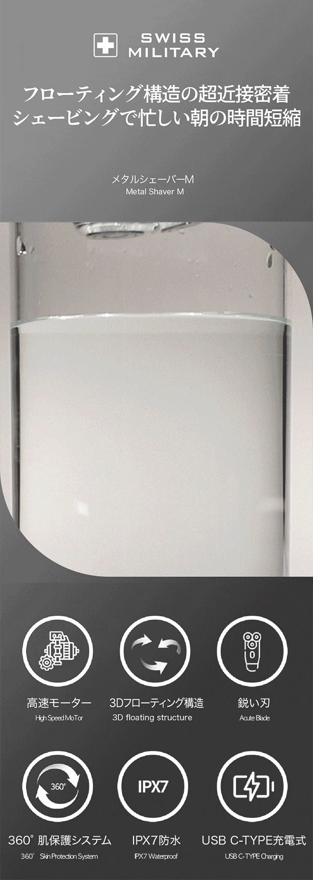 ・この商品を輸入しようと思った理由:毎朝のシェービングで肌を痛めてる男性のために、素早く髭を剃りながら肌を守れる優れた製品力を持つスイスミリタリーをぜひ、紹介したいと思いました。朝しっかり髭を剃っても午後になると剃り残りが見える方、是非メタルシェーバーMですぐにシェービングしてください。