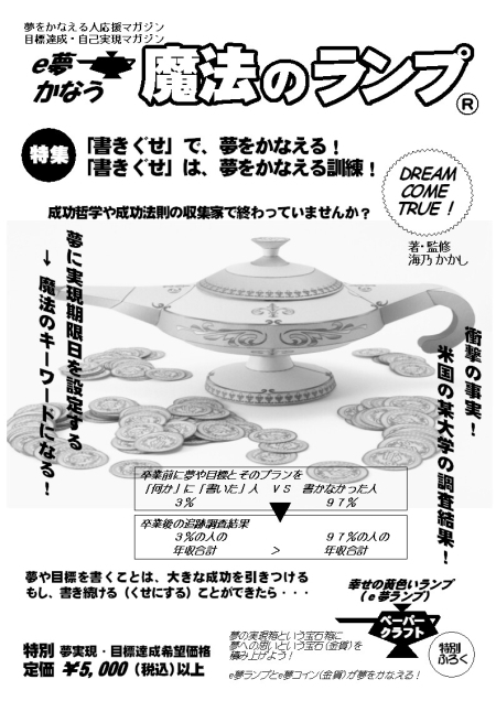 さらに、先に説明させていただきました4つの夢実現日記に次の「e夢かなう魔法のランプ」もセットにして、名付けて「夢実現セット」として5つの自費出版物(現物そのもの)をプレゼントさせていただきます。(合計で市価10,000円相当)