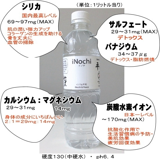 iNochi(イノチ)は、美肌や健康にもうれしいミネラルであるシリカや炭酸水素イオンなどが豊富に含まれているナチュラルミネラルウォーターです。