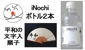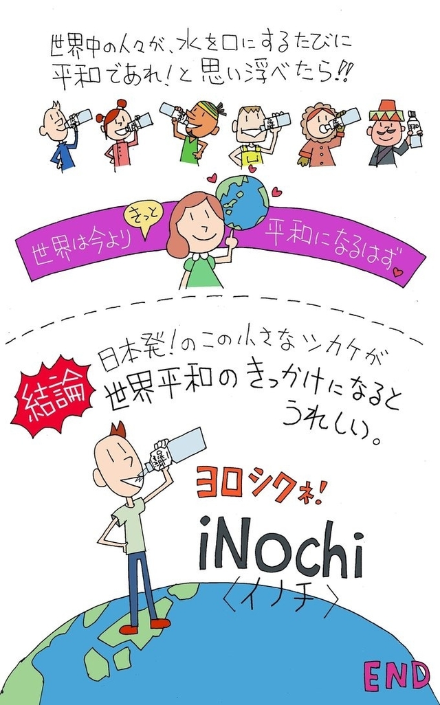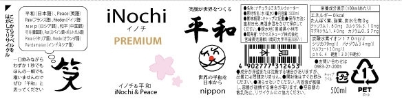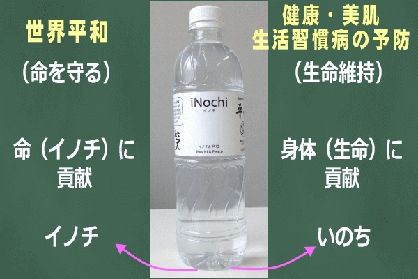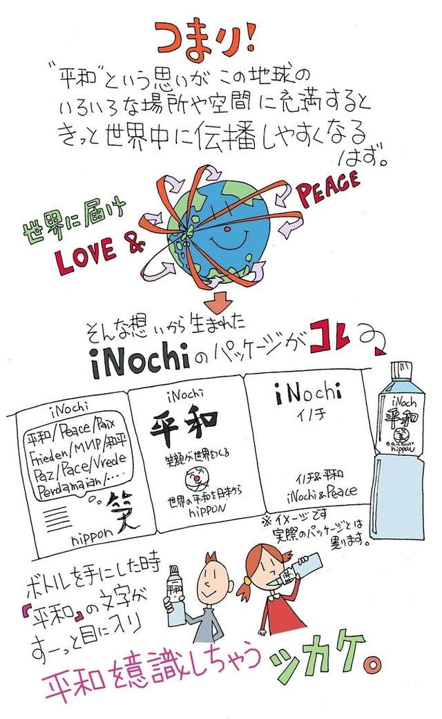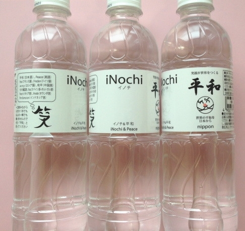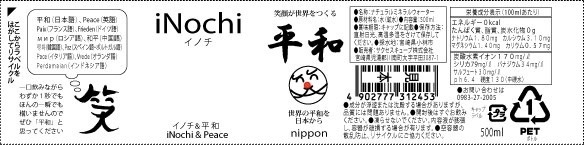 やがては、iNochiの水を飲まなくても、他のペットボトル飲料を飲む時・レストランで出された水を飲む時・家庭の水道から水を飲む時・職場や学校などで水やお茶を飲む時・会議などでペットボトル飲料が出された時・・・・・など、ふと『平和』のことを思ってもらえたらということにつながって欲しいとの願いから誕生させたものです。