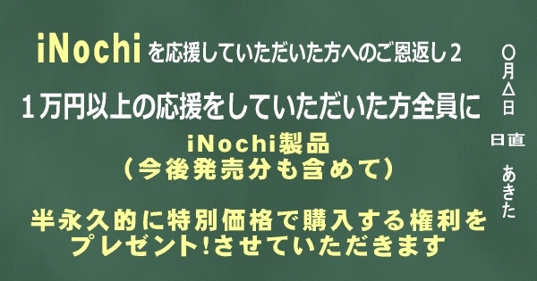 今回、iNochi(イノチ)プロジェクトを応援していただいた方(1万円以上の応援をしていただいた方)に、これから発売する(予定分も含めまして)iNochi製品を、ずっと半永久的に(もちろんご本人さまに限りですが)特別価格で購入していただけるようにします。