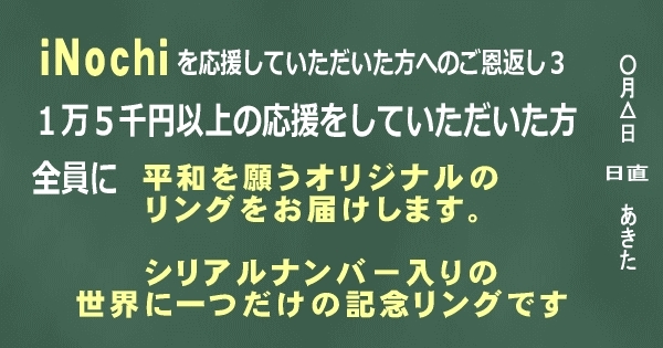 さらに、このiNochi(イノチ)プロジェクトの記念のオリジナルリングを製作するというプランへの参加をしていただくようにも考えております。