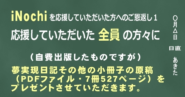 金額にかかわらずiNochi(イノチ)プロジェクトを応援していただいた方には、iNochi(イノチ)発売後(平成26年8月15日以降順次)に、私のつたない自費出版物ですがその原稿ファイル(PDFファイル・7冊527ページ分)をプレゼントさせていただきます。
