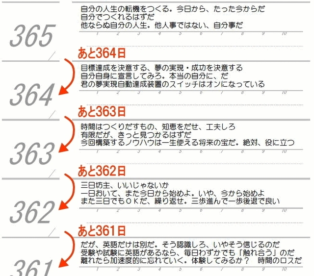 あと365日、あと364日、363日・・・受験日(試験日)当日・・・という具合に目標達成予定日までのカウントダウン形式に記入していく日記帳(手帳)です。A5版・68ページ