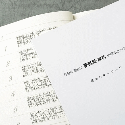 365日使えるもの、カウントダウン式に記入していくもの、日替わりで夢実現までの意識づけのためのコメント・メッセージが入ったもの等々があります。