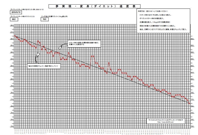 カウントダウン式に記入していきながら、当初の思い・熱意を忘れることなく日々のウエイトを意識することでダイエット成功につなげるものです。