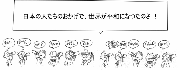 その日本発の「平和」という思いが世界中に広まって、世界中の人たちの思い・意識が変わり、今ではこの地球上から争いゴトが消滅したんじゃよ」
