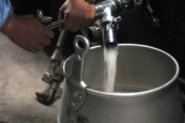 琺瑯タンクで熟成させた銀ラベルのお酒は、澄み切った透明。はじめにストレートでひとくち。