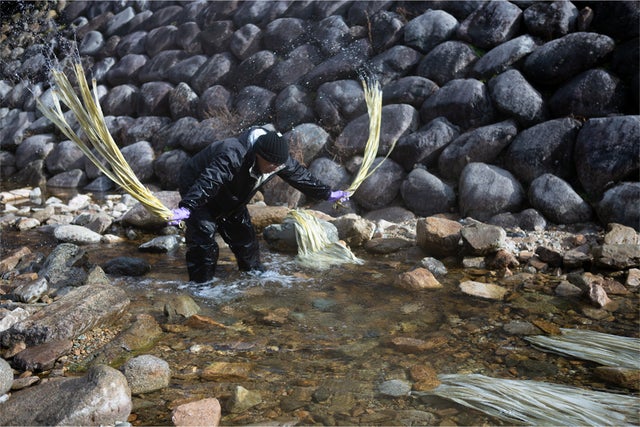 杉原川で行われる川ざらしと言う作業です。白皮を杉原川に一昼夜浸して、冷水、日光、雪など自然を利用して白くする極寒に厳しい工程です。