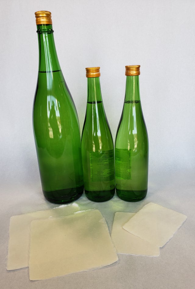 富久錦さんで醸造、瓶詰されたお酒は税法上必要な表示を貼り表は無地の状態で出荷していただき、字酒ラベル用に1.8Lと720mlの大きさに合わせて専用に作って頂いた杉原紙と井乃屋で出会います。