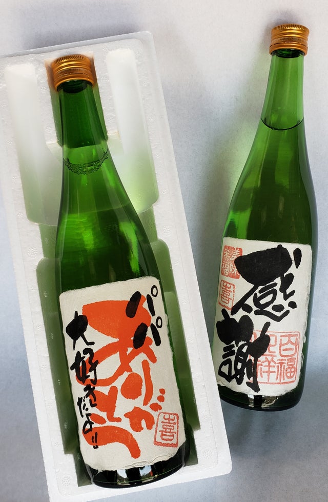 特A地区東条産「山田錦」100%で酒蔵「富久錦」さんが仕込んだお酒に手漉き和紙「杉原紙」にご希望の言葉を筆文字フォント「鯨海酔侯」の作者である店主が一枚一枚心を込めて手書きしたラベルを貼り付けたのが「字酒」です。