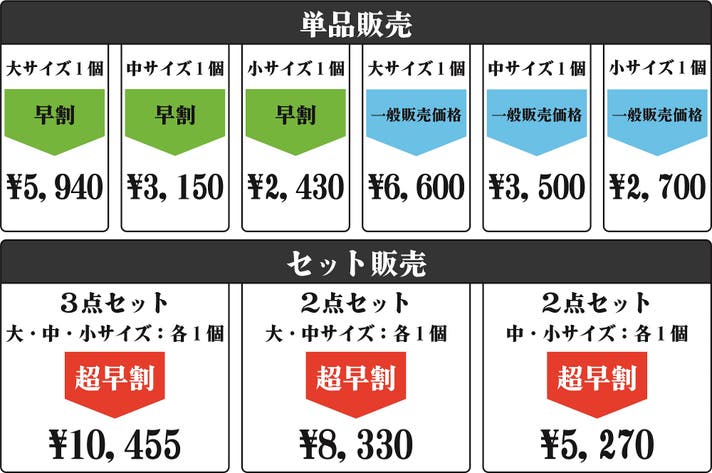 【15%OFF】超早割:セット販売(大サイズ1点、中サイズ1点、小サイズ1点)。