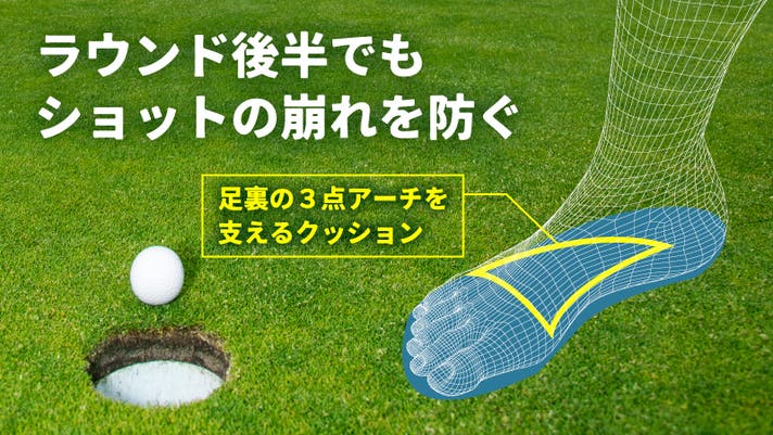 足のアーチを適度にサポートし、クッション性を高めた事でラウンド後半も快適。まるでいつでも1ラウンド目の様なパフォーマンスを実現します。