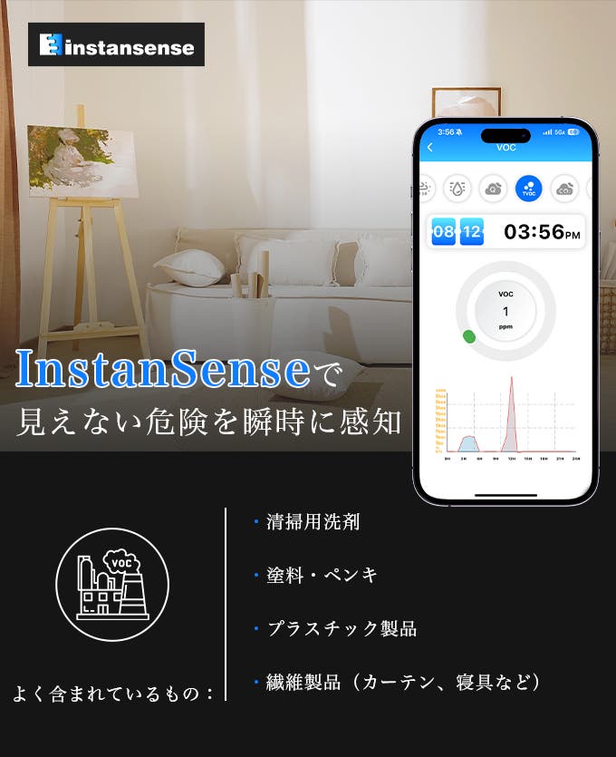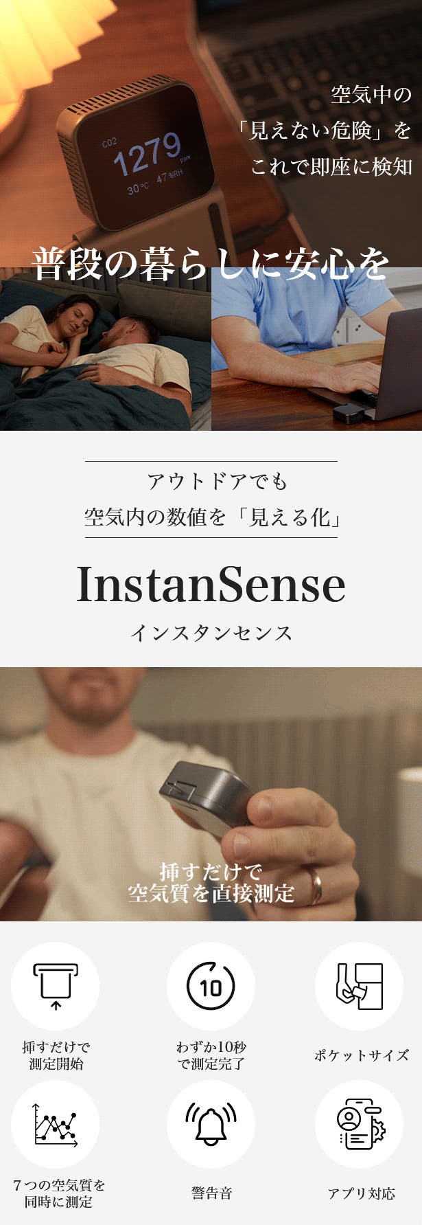 InstanSenseは専用アプリと連携することで、空気質データをスマートフォンでいつでも確認可能。