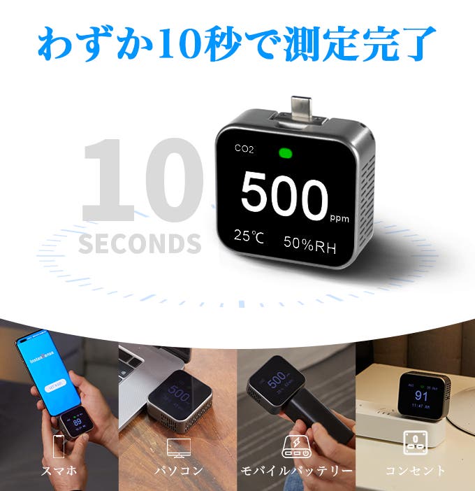 面倒な設定は一切不要。スマホ・パソコン・モバイルバッテリーなどの電源に差し込むだけで、すぐに空気質の測定をスタート。わずか10秒で室内の空気の状態が分かるので、換気が必要なタイミングも簡単に把握できます。