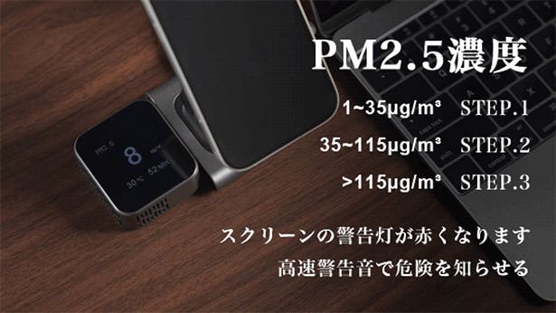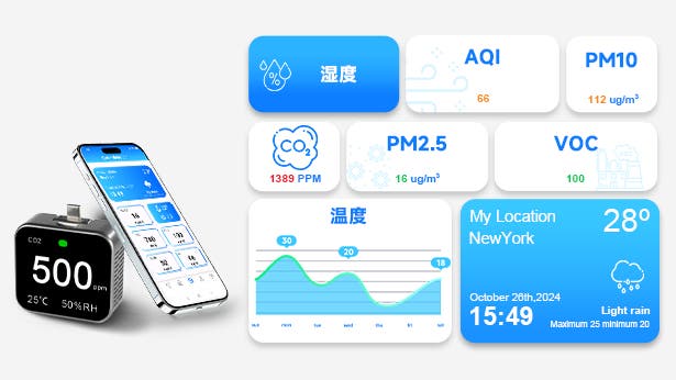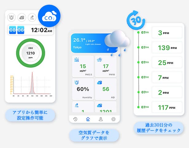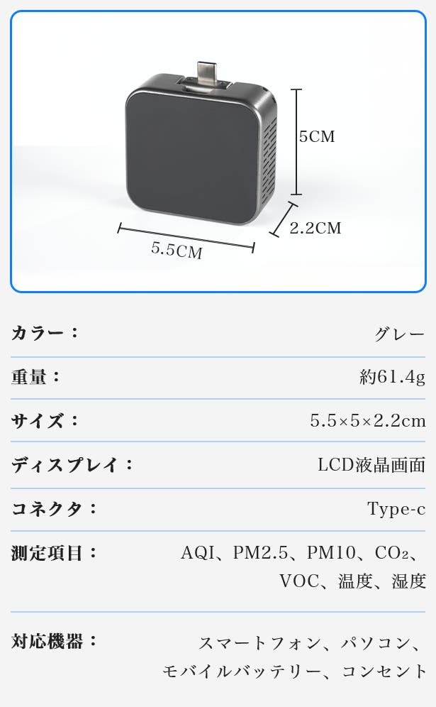 この製品は、AQI、CO₂、PM10、PM2.5、VOC、温度、湿度、の7項目をリアルタイムで測定でき、数値をLCD画面と専用アプリで一目で確認できます。