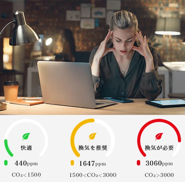 会議室や寝室などの密閉空間では、特に人が多く集まるとCO₂(二酸化炭素)の濃度が急速に上昇することがあります。