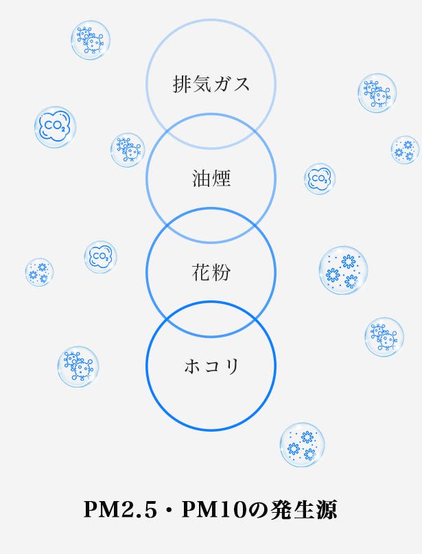 PM2.5やPM10は、大気中に多く存在する、危険とされる微小粒子です。