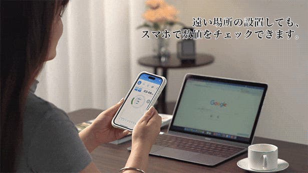 寝室・オフィス・子ども部屋などに設置しても、離れた場所からリアルタイムで空気の状態を把握できます。大切な家族の空気環境を、どこにいても見守れます。