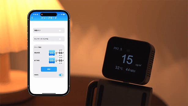 睡眠モードは専用アプリからワンタッチで起動可能。画面やセンサーを手動でオフに設定できます。InstanSenseは休みを妨げることなく、静かに空気質の測定を続けます。