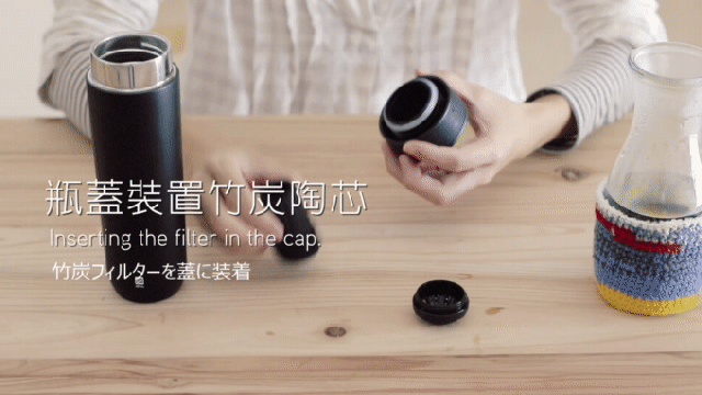 マグボトルに水やお湯を8分目まで淹れ、ボトルを逆さに置くと竹炭セラミックフィルターが水に溶けている雑味や臭いの不純物を吸着し、水の味をまろやかにします。