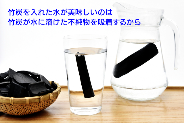 昔から「竹炭を入れた水は美味しくなる」と言われていますが、それは竹炭が表面にミクロの穴を多数持つ多孔質の物質で、毛細管現象で水中の臭い物質や余分なミネラルを吸着して浄化するから。