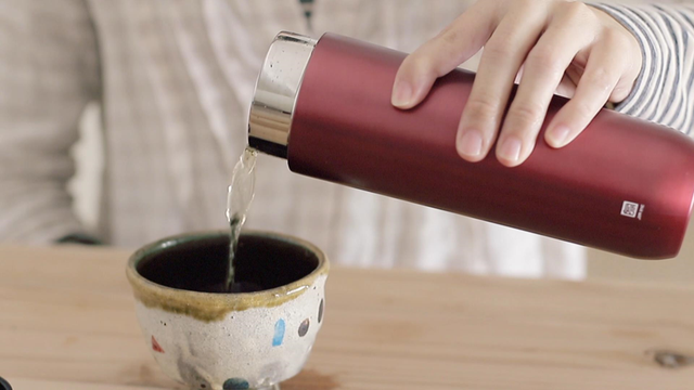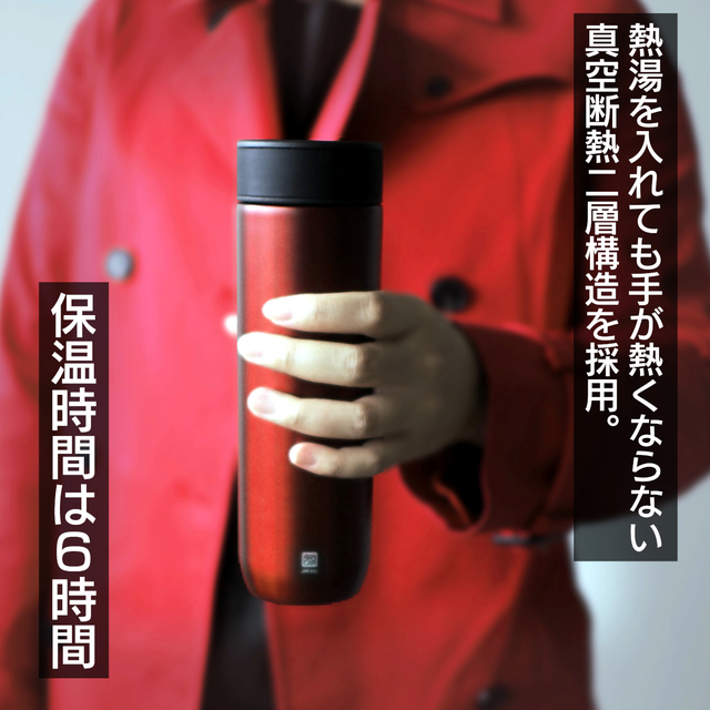 熱を使えやすいステンレス製のボディでも真空の壁が中の水と外気の温度を遮断するため保温性が高く、90℃の度の熱湯を入れた場合、2時間後で80℃、6時間後でも50℃と熱々状態※。