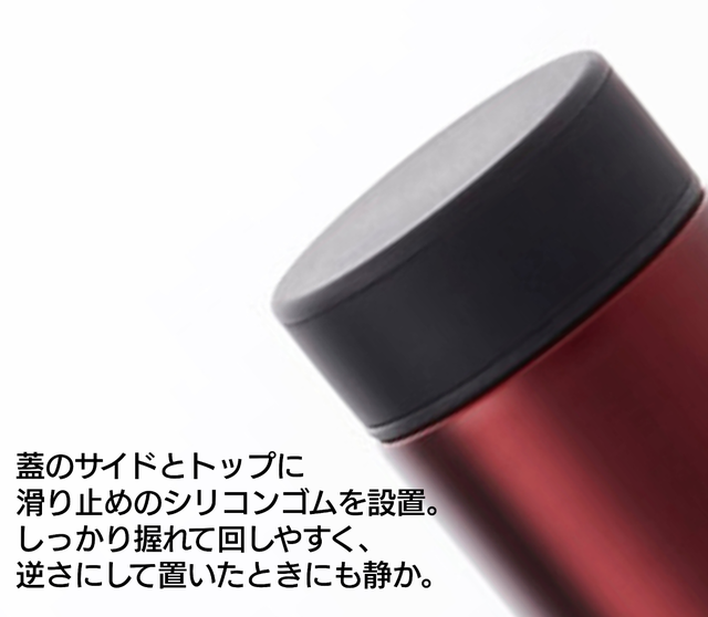 またボトルの上下の面もシリコンゴムを設置。緩衝材の役割も果たすので、テーブルの上に置いた時に音を立てずに静か。図書館など小さな音でも周囲に迷惑を掛ける場でも、喉に潤いを与えてくれます。