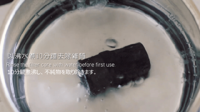 初めて使用する時は、蓋から竹炭セラミックフィルターを取り外し、軽く水洗いして10分ほど煮沸してください。フィルターに残っている雑味成分を取り除きます。