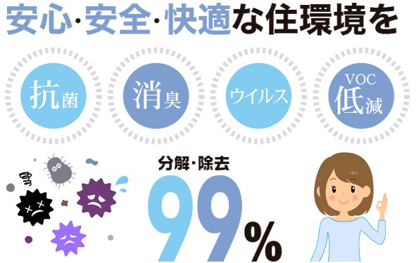 光のエネルギーにより、有機物の汚れを分解したり、細菌の不活化を行う次世代型環境浄化物質です。それにより、除菌・抗菌・消臭効果を実現。人体には無害で、安全・安心で快適な生活空間を提供します。