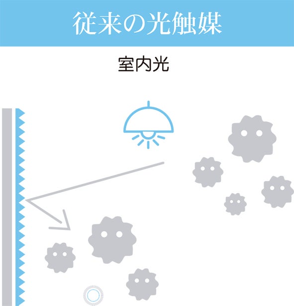 従来の光触媒は、酸化チタンを使用しています。酸化チタンは主に紫外光(太陽光)で光触媒効果を発揮しますが可視光(室内光)では低い光触媒効果しか出せません。