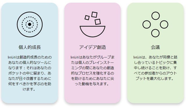 Intuitiは、もともとは静かに座り、創造的に考える時間をとるための、個人的な使用のために設計されたものです。反対に、それを人々に提示し、大学コーディネーターや企業コンサルタントからのフィードバックを受けて、Intuitiは、他の興味深いアプリケーションを持つことが出来ました。それは学校で、自分のアイデアや提案を共有するのに慣れていない人たちに自分の創造性のテーマを紹介する「魅惑的で型にはまらない方法」です。