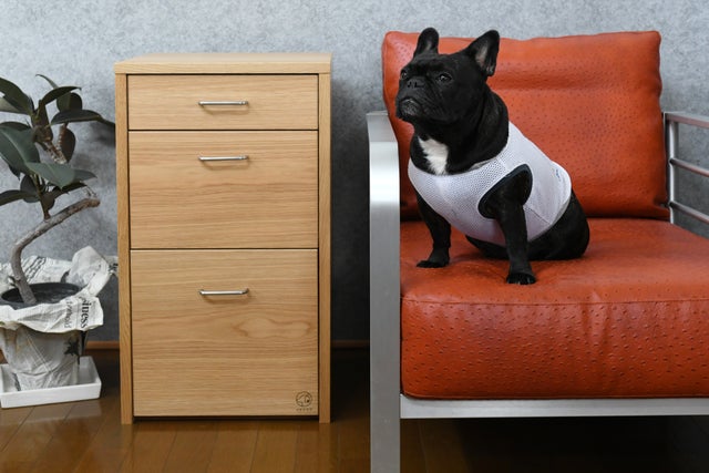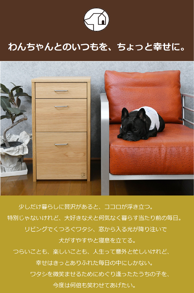 犬に関連するグッズを収納しやすく工夫したチェストです。