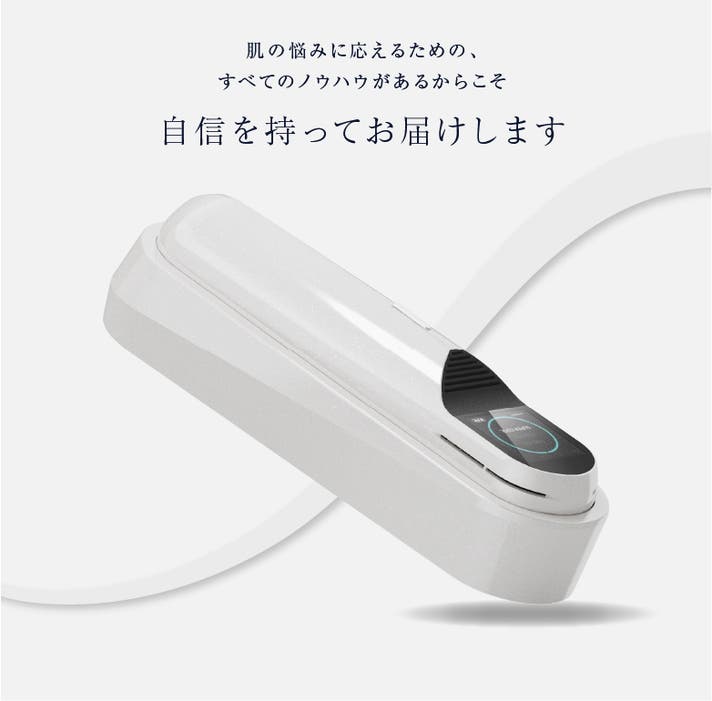 ①適量の化粧品(※)を顔に塗布した後、電源ボタンを3秒間押すと電源が入り、スピーカーからウェルカムメッセージが流れます。※すべての種類の化粧品にご使用いただけます。