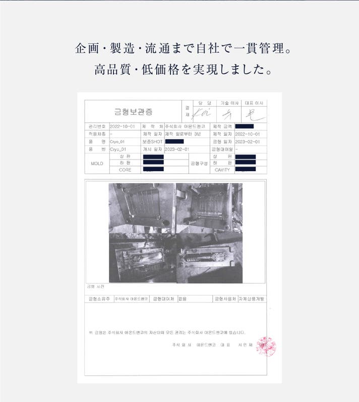 「イオニック クライオ スティック」のメーカー、Almond&co., ltd.です。イオニック クライオ スティックは、企画から研究開発まで韓国本社で直接進行し、中国青島にある自社100%工場で製造しています。したがって、すべての製品は徹底した品質管理のもとで生産されており、その中には私たちチームの多くの思考、時間、そして真心が込められています。