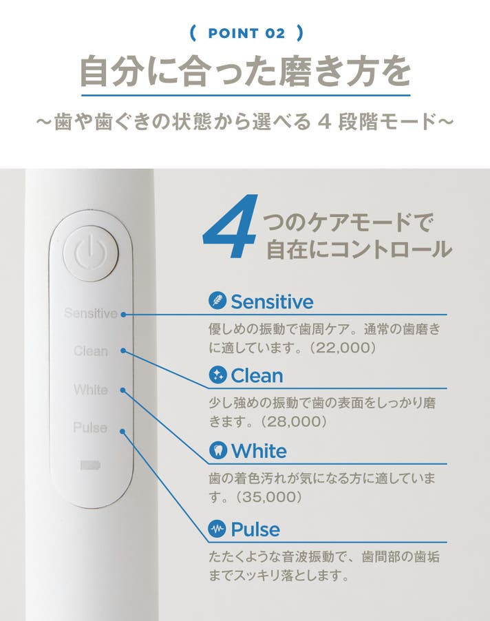 そんな電動歯ブラシの“よくある悩み”を、選べるモードで解消。使う人に寄り添う、やさしくて頼れる1本に仕上げました。