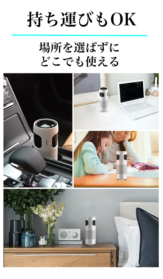 仕事で使うデスクの上に置いたり、就寝の際のベッドの横に置いて使えば、普段の生活の中で気軽にポータブルに持ち運ぶ空気清浄機としても使えます。