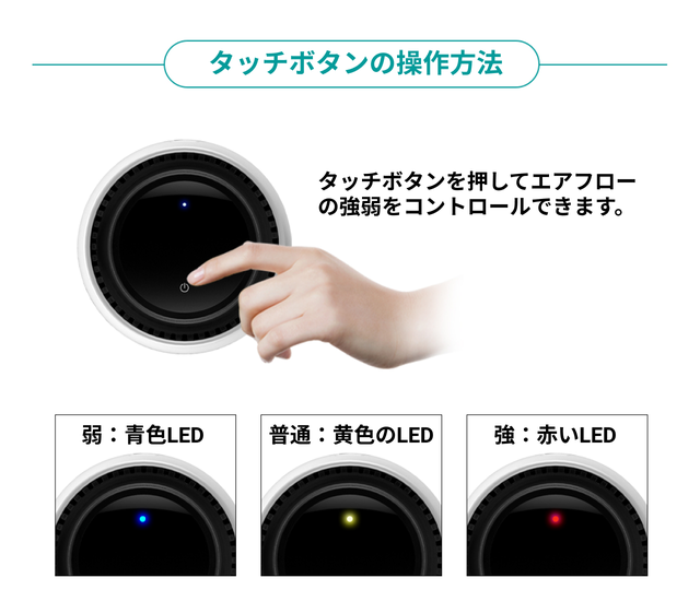 電源が入っている状態で、タッチボタンを押してエアフローの強弱(弱い>普通>強い)をコントロールできます。