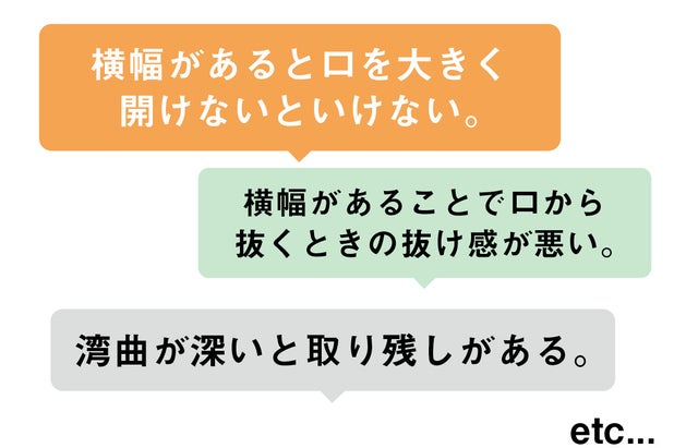 また、湾曲部分の深さですが、深くすることで当然ながらたくさんの量をすくうことができるものの、お口から抜く際に取り残しが多くなります。