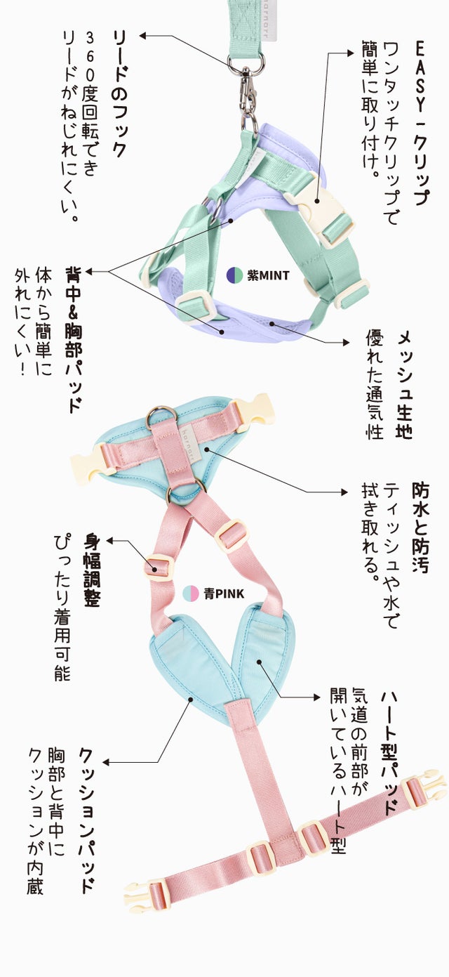 - ふんわりクッションがハーネスに内蔵されているから急にリードを引っ張っても優しくブレーキ!