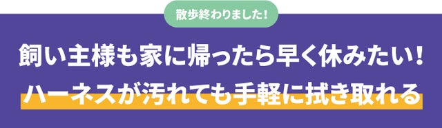 また、生活撥水なので汚れた表面をウェットティッシュや流水で拭き取れるので、 簡単にハーネスの清潔さを保つことができます。