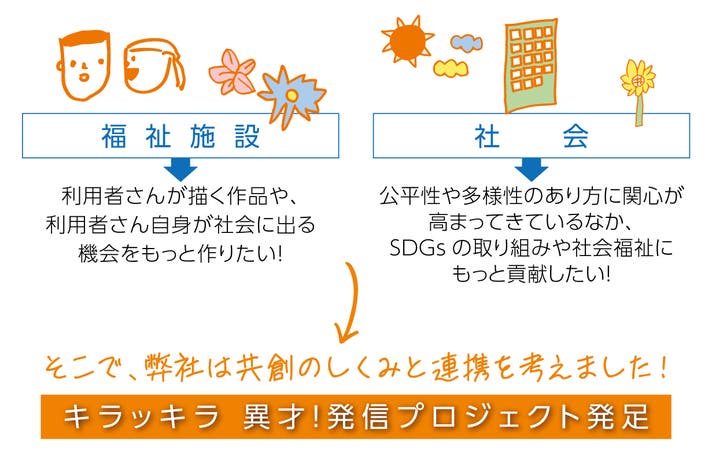 私たちは、福祉施設で日々生まれている、まっすぐで自由で、何ものにも代えがたい“異才”のアートを、社会の中で輝く「作品」として届けたいという想いから、この「キラッキラ異才!発信プロジェクト」を立ち上げました。