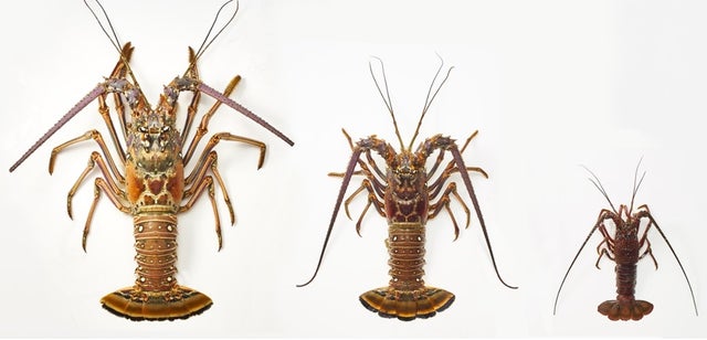 左が2kgのベネズエラ産イセエビ、中央が800gのベネズエラ産イセエビ、右が国内平均の200gのイセエビです。