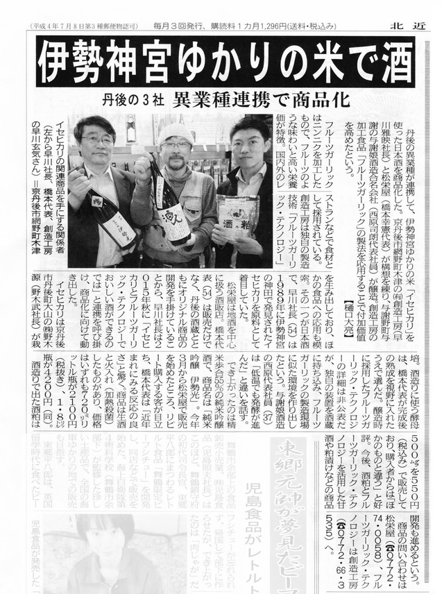 京都北部の丹後は、伊勢神宮外宮の豊受大神(食べ物の神様)がご出身の地と言われ、また、米作り、酒造り、養蚕を伝えた羽衣天女伝説が残っています。今回、丹後の酒人(さかんど 神に供える酒の醸造をつかさどる人)が集い、熱い想いと、伝統的な技術、フルーツガーリック生産で培った特殊な発酵技術を組み合わせて、神様に捧げるためのお酒<清酒 純米吟醸 伊勢光>を創り出しました。