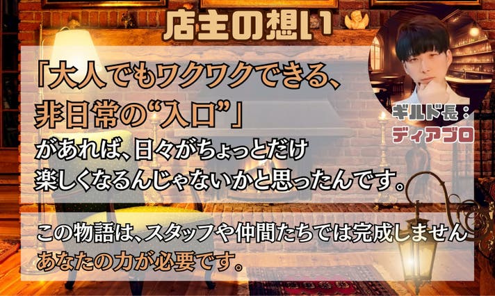 「異世界の扉」を舞台にしたオリジナルストーリーを執筆。来店者がギルドの一員として物語に参加できるような世界観を設定。
