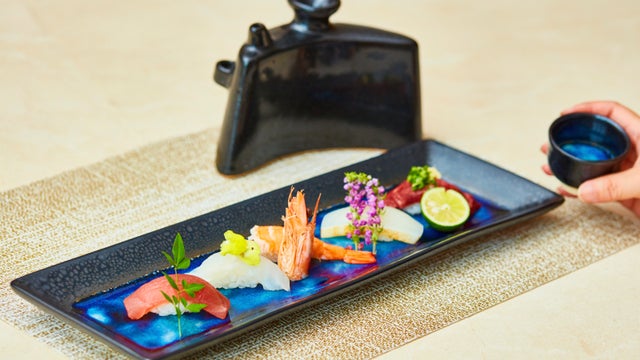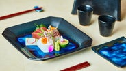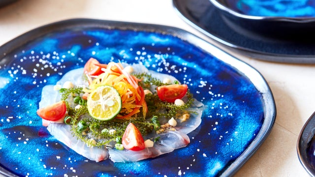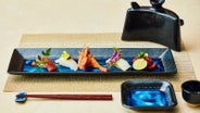 油滴天目と石垣ブルーの色合いのバランスが良く、縁の深さも程よくあるので、とても趣のあるお皿です。お刺身やお寿司の様な和食はもちろん。前菜や晩酌のおつまみも二人分でゆっくりと盛付出来るサイズです。