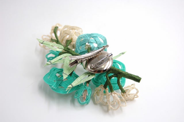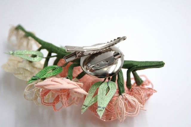 洋服やバッグに付けたり、または髪飾りとしてお使いください。
